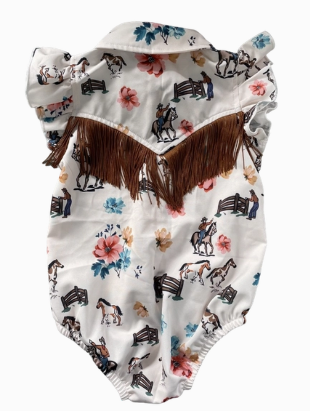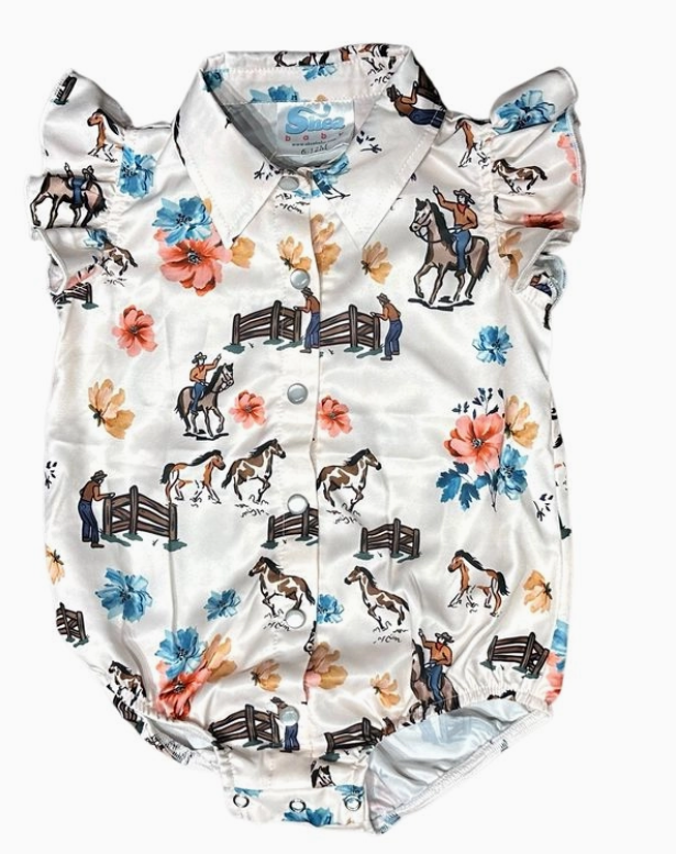 A Classic western staple for your little one! Shea Baby Ranch Hand SS Onesie features pearl snaps, durable fabric and a light weight fabric.