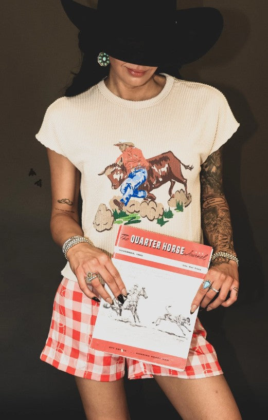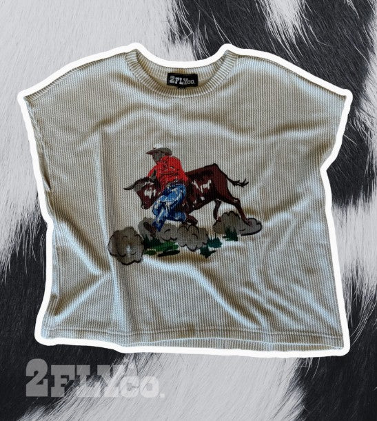 the hazy hazer is giving simple western. it's got the textured ribbed fabric with a bulldogger graphic that has been a HIT.